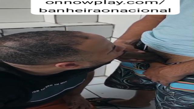 Endurecendo o rolão do muleque na boca dentro do banheiro da feira.